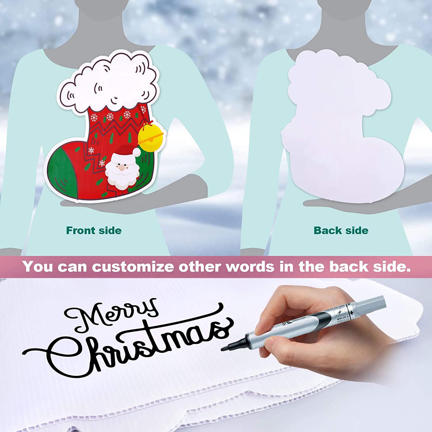 đăExtra Large SizeăEach large Christmas lawn sign supplies are in different sizes. Santa Claus sign is 39cm*36cm/15.4"*14.2", snowman sign is 27cm*34cm/10.6"*13.4", Christmas tree sign is 30cm*38cm/11.8"*14.9", crutches sign is 32cm*33cm/12.6"*13", reindeer sign is 26cm*39cm/10.2"*15.4", socking sign is 25cm*35cm/9.8"*13.8". Large enough to stand out from a distance and attract guests' attention effortlessly.