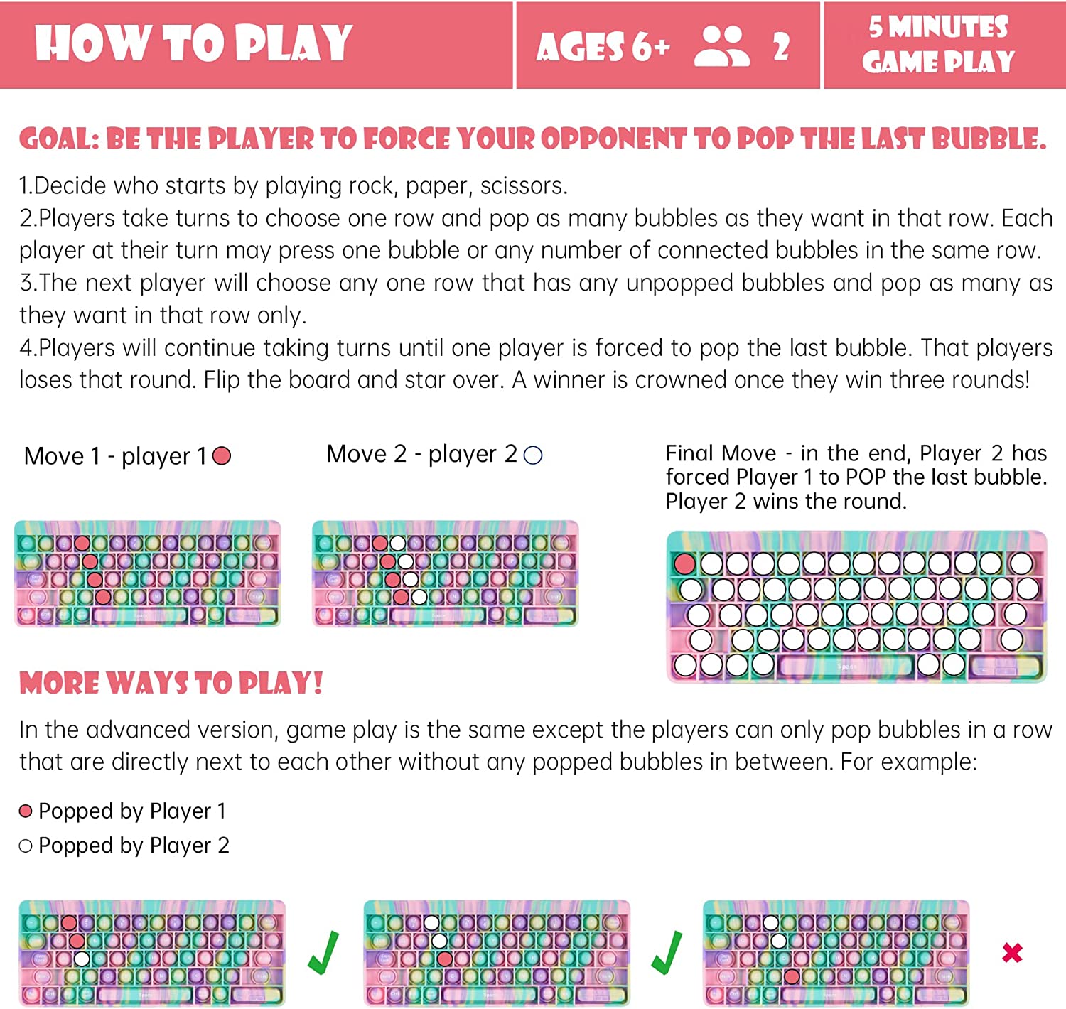 ⚫【Bubble Popping Fun】Children can learn colors, shapes, alphabet and algebra to meet various early age learning needs, and there are so many ways to have fun with these sensory toys! For 3-6 years old junior poppers, the sensory fun can keep them busy popping and learning fine motor skills. And for 6-10-year-olds, 2 players can play fun popping games. Beautiful colors and shapes are perfect for party favors, birthday gifts and more! Color: Tie-Dye Red/Black Camouflage.