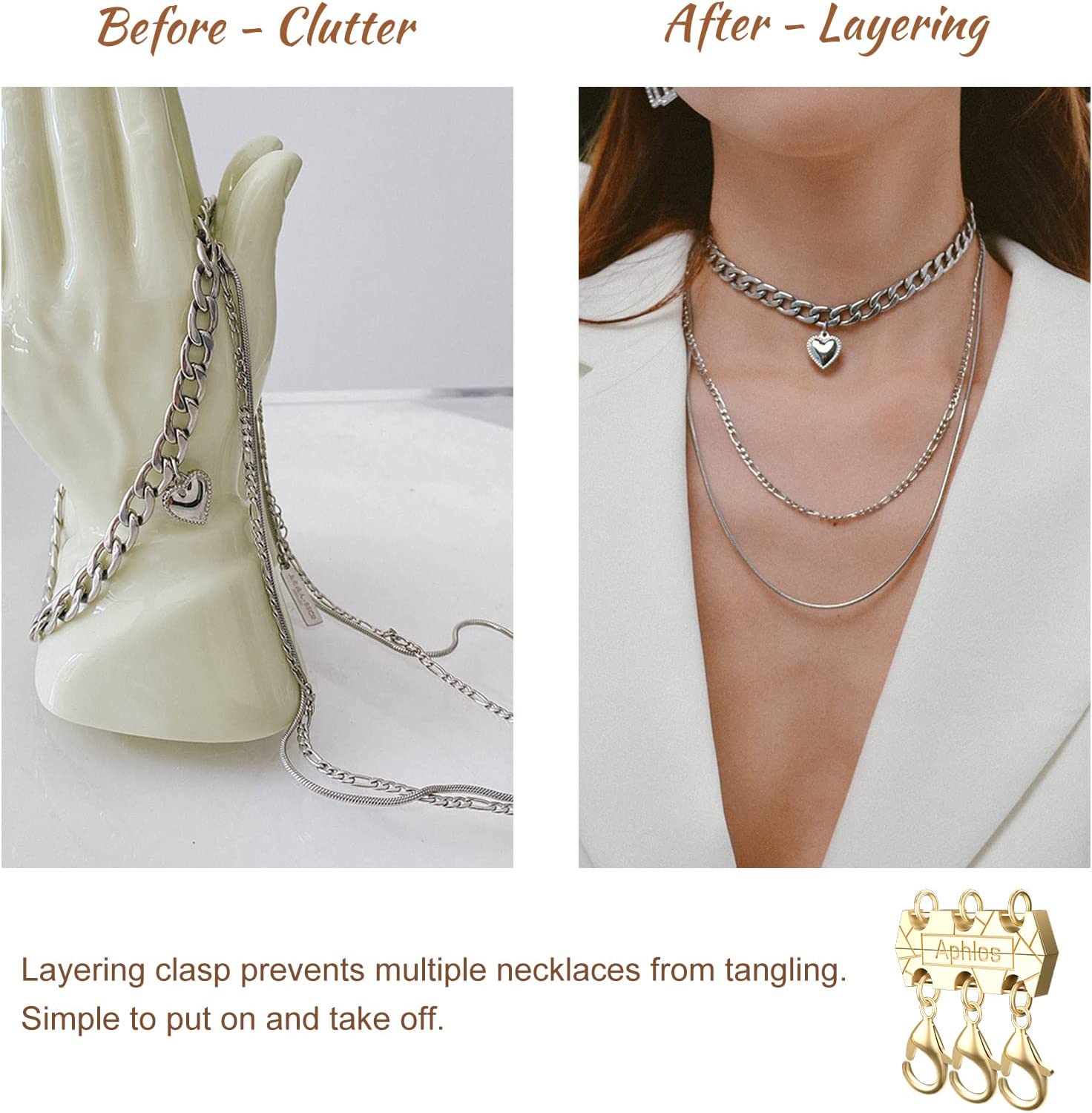 ⭐【Eliminates Tangles】Layered jewelry should be simple and beautiful. Our handy multi-layer necklace clasp will protect multiple necklaces from entanglement, keeping you in tip-top shape at all times. Easy to connect and detach, you can align 3-6 of your favorite necklaces for effortless putting on and off. Loading capacity: 4 lbs.